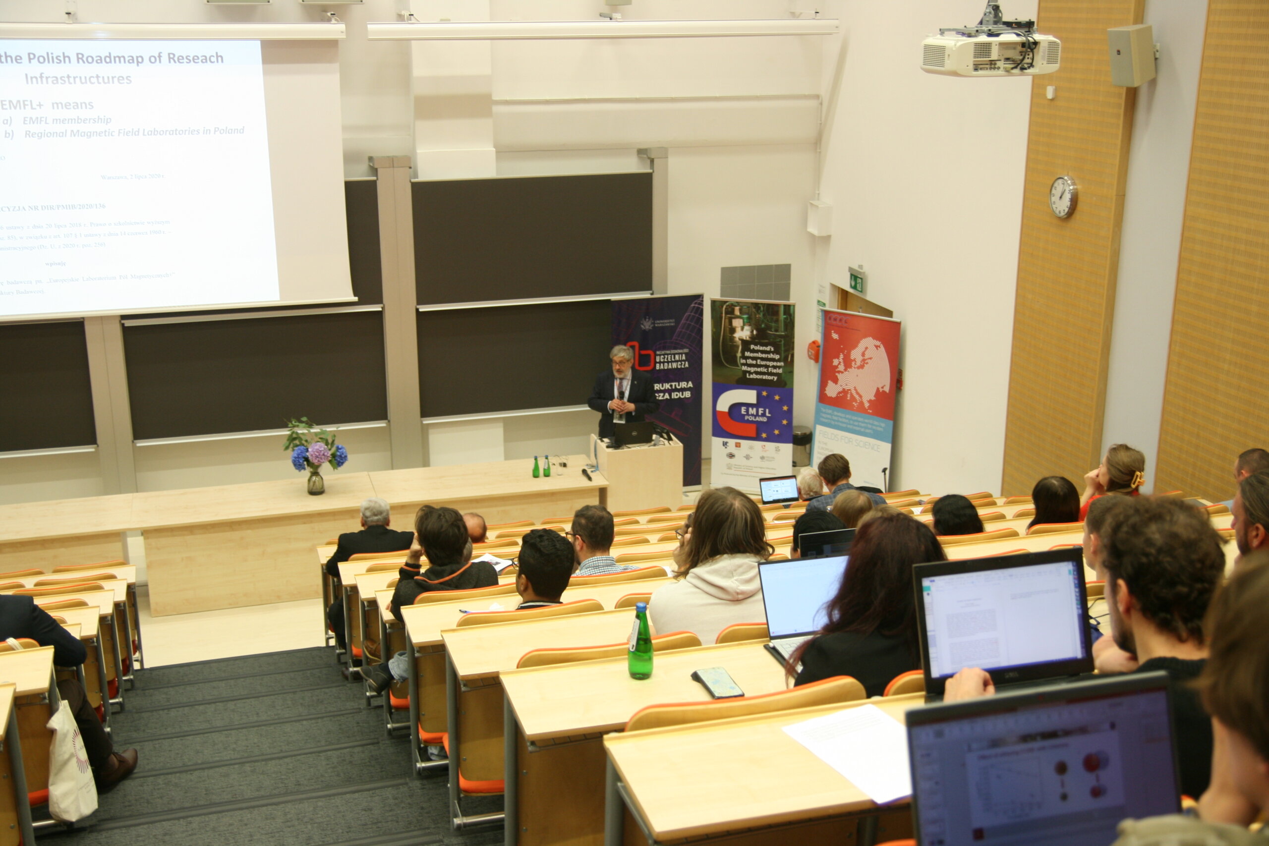 Aktualny projekt wspiera także społeczność badaczy poprzez aktywności upowszechniające wiedzę. Pierwszym kamieniem milowym wyznaczającym kierunek tej działalności stała się konferencja EMFL-Poland Kick-off Meeting, która odbyła się na Wydziale Fizyki 30 września 2025 r. Rozpoczęcie tego wydarzenia uświetniły wystąpienia prof. dra hab. Zygmunta Lalaka – prorektora ds. badań UW i kierownika programu IDUB – oraz prof. dra hab. Wojciecha Satuły – dziekana Wydziału Fizyki UW – którzy zwracali uwagę na znaczenie infrastruktury Uniwersytetu dla jakości prowadzonych tu badań. Ponad czterdziestu słuchaczy miało możliwość zapoznania się z najnowszymi osiągnięciami badawczymi i możliwościami eksperymentalnymi oferowanymi przez laboratoria EMFL. Spotkanie pozwoliło także na nawiązanie bezpośredniego kontaktu z przedstawicielami tych jednostek, w tym dyrektora HMFL-FELIX z Nijmegen, prof. Marca Baldusa. Wyniki tych rozmów bez wątpienia przyczynią się do dalszego rozwoju prowadzonych w Polsce badań materii skondensowanej w polach magnetycznych.